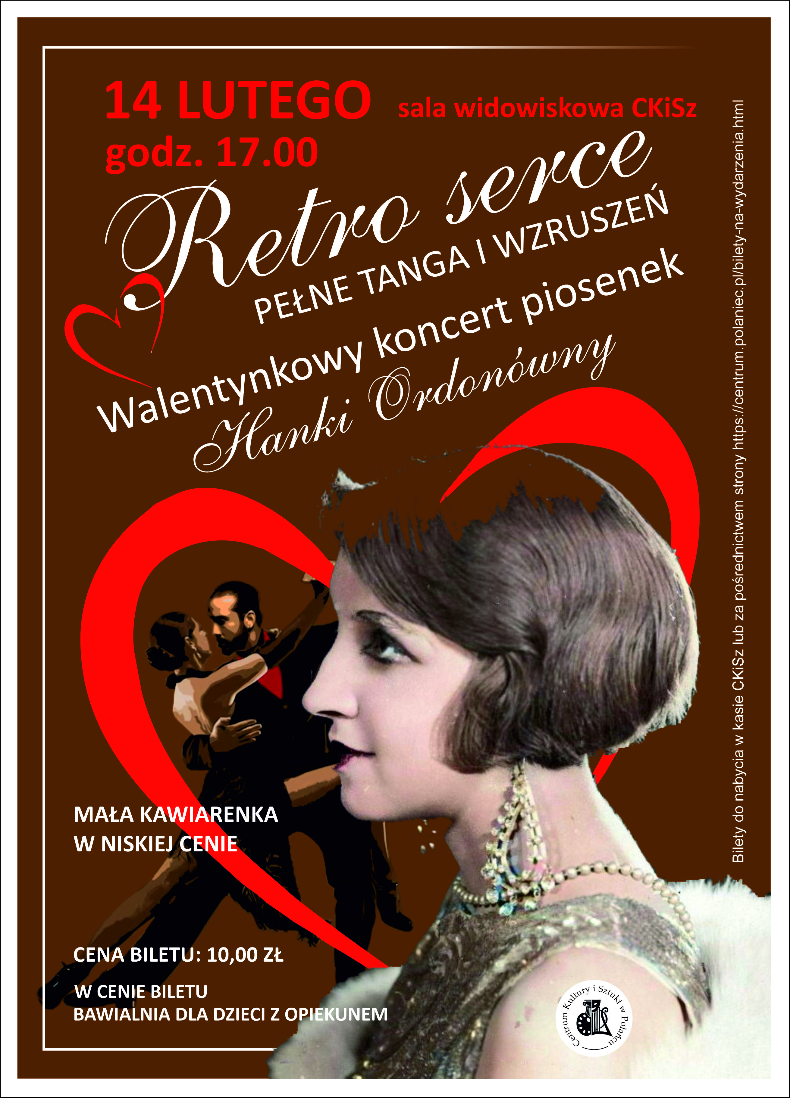 Walentynkowy wieczór spędzony przy dźwiękach piosenek Hanki Ordonówny stanie się okazją do wspólnego przeżywania wzruszeń, wspomnień i artystycznych emocji – idealną alternatywą dla tradycyjnych walentynkowych atrakcji. Na scenie wystąpi Zespół Sidus i grupa teatralna Maska z Centrum Kultury i Sztuki w Połańcu.